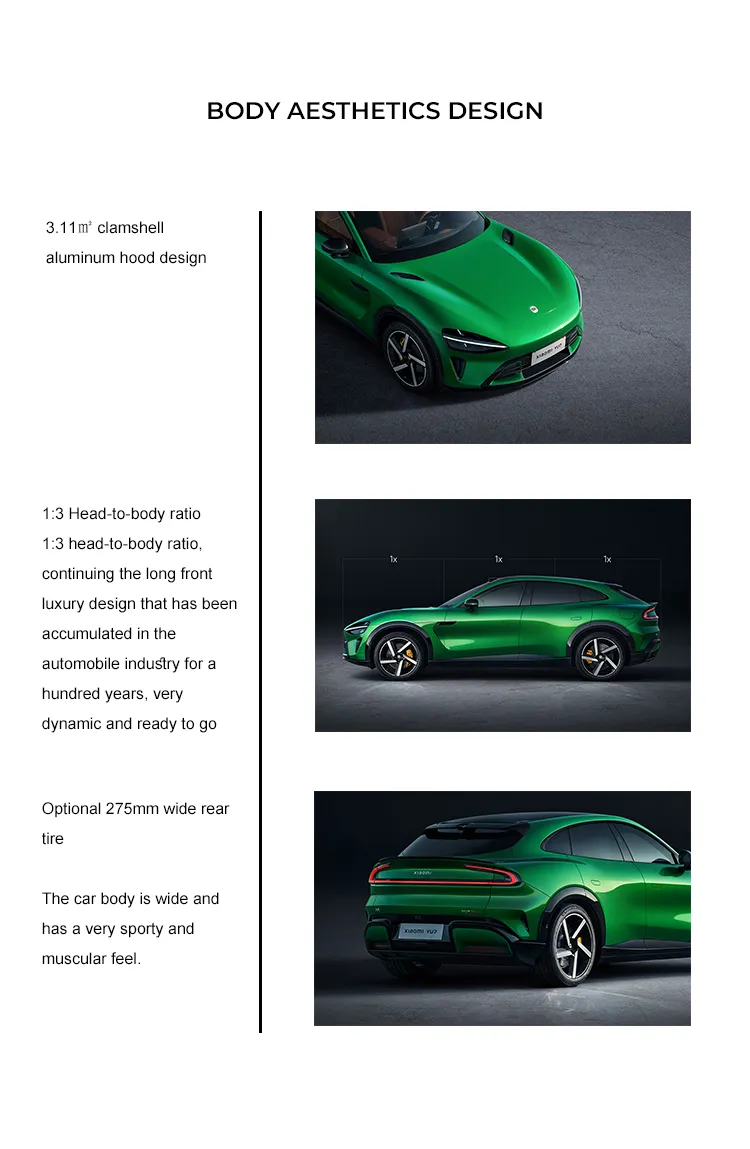 این وسیله نقلیه یک طرح بدنه برگشتی را اتخاذ می کند و صورت جلو با استفاده از نوار نوری متقاطع ، طراحی بسته ای را اتخاذ می کند. طول ، عرض و ارتفاع کل خودرو 4999*1996*1608 (1600) میلی متر ، با چرخ چرخ 3000 میلی متر است. طرف مجهز به یک درب بدون قاب و یک طراحی دسته پنهان است که هم زیبا است و هم می تواند مقاومت باد را کاهش دهد. این خودرو "سیستم نمایش پانوراما صفحه نمایش آسمان" را که از سه صفحه کوچک ساخته شده است ، اتخاذ می کند. فرمان سه جاسوسی مجهز به مکانیزم دنده ای است که برای کار کردن مناسب است. صندلی های این خودرو با چرم Nappa پوشانده شده است ، ردیف جلو یک صندلی ورزشی یکپارچه است و مجهز به صندلی های گرانش دو صفر و عملکرد ماساژ 10 نقطه ای است. ردیف عقب همچنین از 100 درجه ~ 135 درجه تنظیم کننده تنظیم کننده برقی پشتیبانی می کند. علاوه بر این ، شیائومی YU7 دارای 36 فضای ذخیره سازی از جمله یک تنه با حجم 141L است.