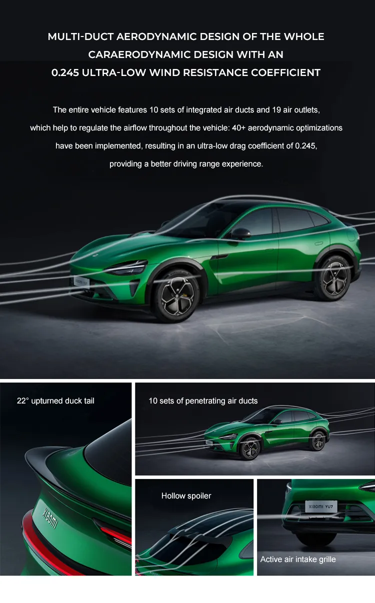 مزیت Xiaomi Yu7 این است که برای تحقق تجربه اکولوژیکی هوشمندانه از اتصال "ماشین انسان" و قدرت قوی ناشی از تنظیم ورزش ، به اکولوژی خانه هوشمند شیائومی متکی است. نسخه با قدرت بالا چهار چرخ به سرعت سرعت می یابد و عملکرد فوق العاده ای دارد. پلت فرم ولتاژ 800 ولت سرعت و استقامت بسیار خوبی را به همراه دارد.